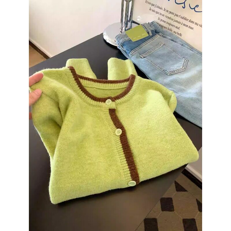 韩系绿色撞色边针织开衫女秋季新款软糯纽扣毛衣外套温柔减龄上衣