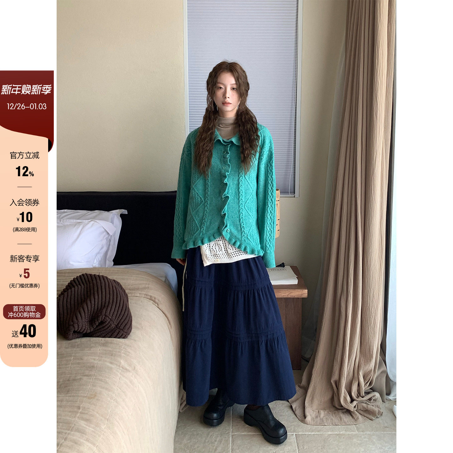 CCKOK 冬季韩系穿搭薄款荷叶卷边麻花绿色针织毛衣开衫外套上衣女
