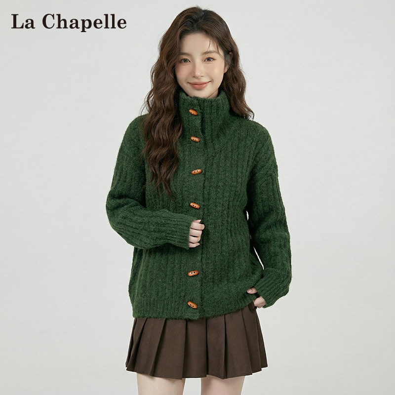 拉夏贝尔绿色高领针织毛衣女秋冬新款氛围感宽松加厚保暖外套上衣