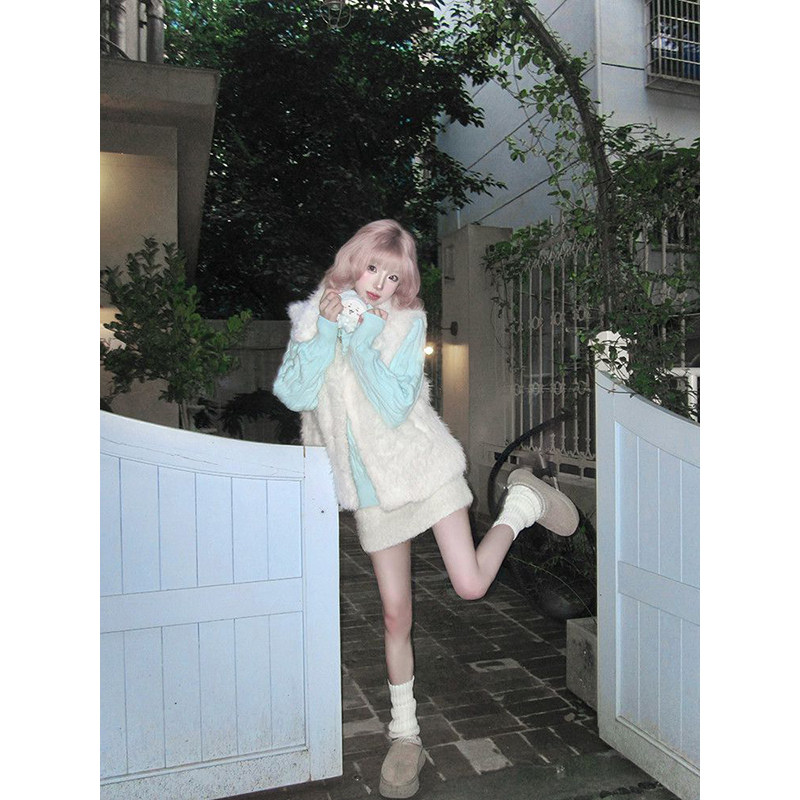 法式慵懒学院风两件套绿色麻花开衫毛衣女学生+毛毛保暖马甲外套