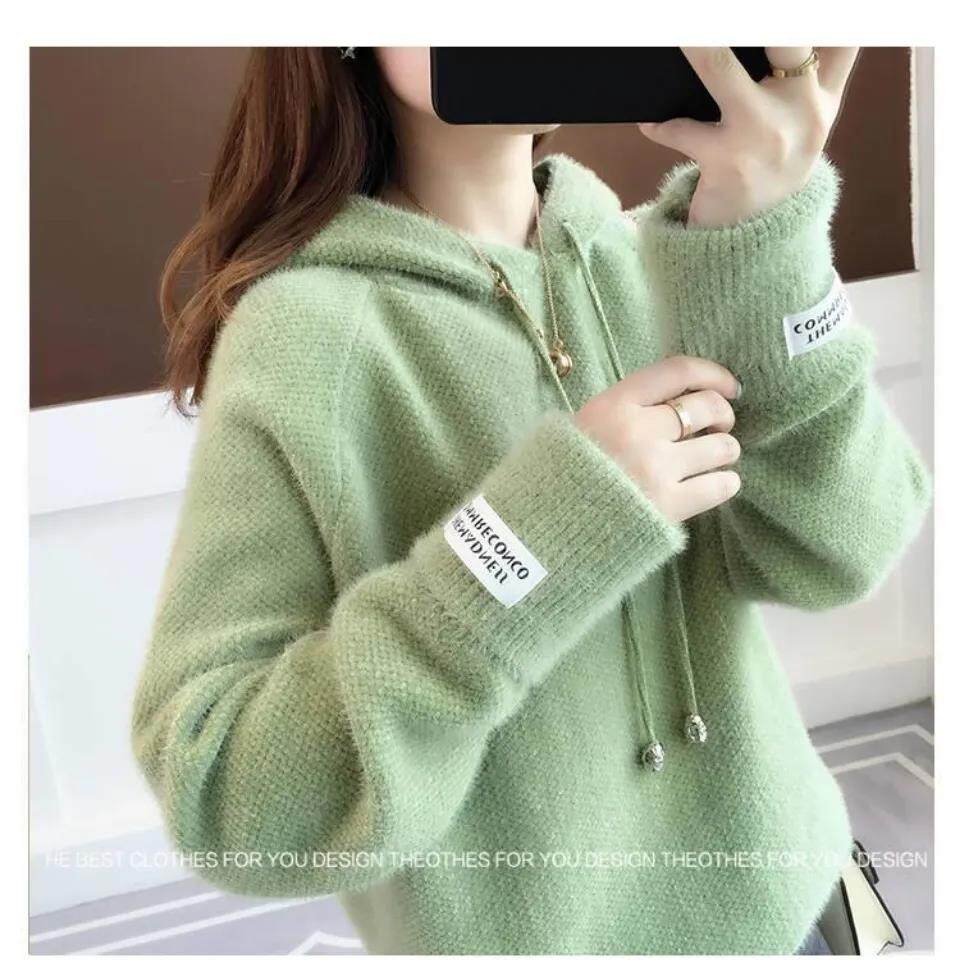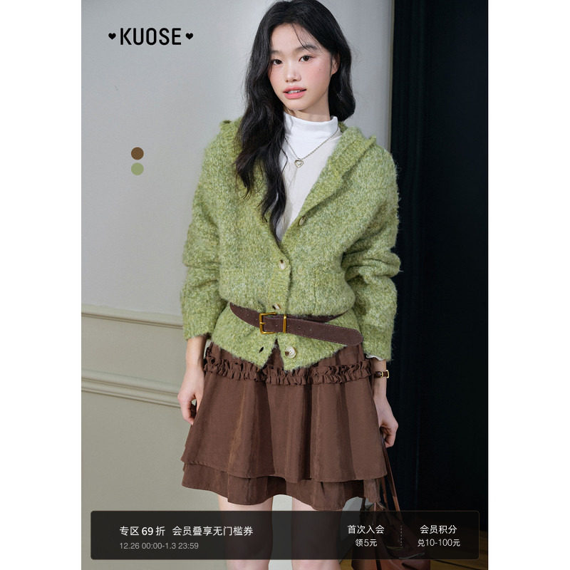 阔色绿色长袖开衫连帽毛衣外套女25秋冬季新款咖啡色软糯毛衣短款