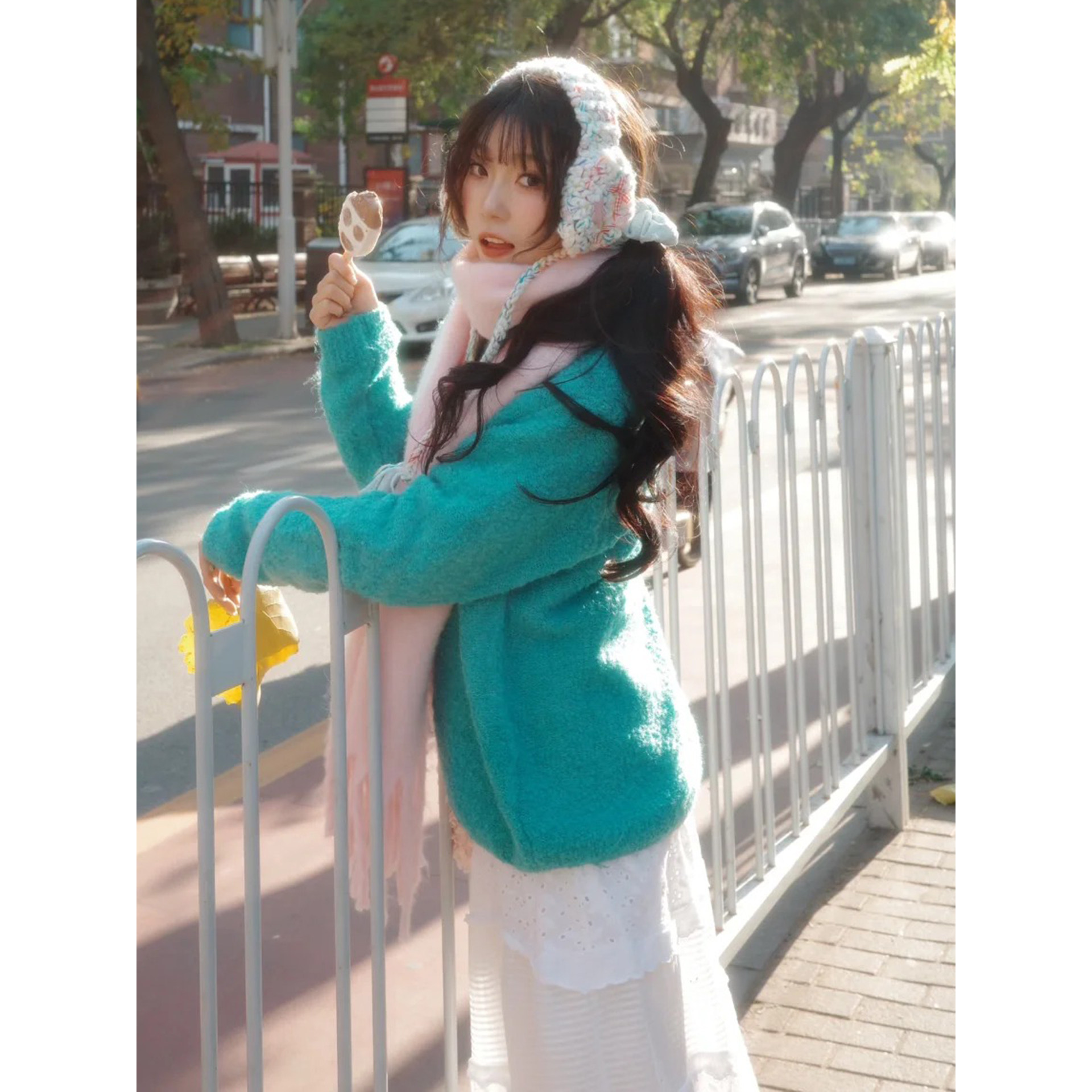 日系小清新湖水绿色圆领毛衣外套女冬软糯奶fufu学生长袖针织开衫