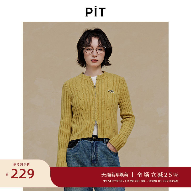 Basic House/百家好绿色圆领针织开衫女刺绣拉链款宽松毛衣外套秋
