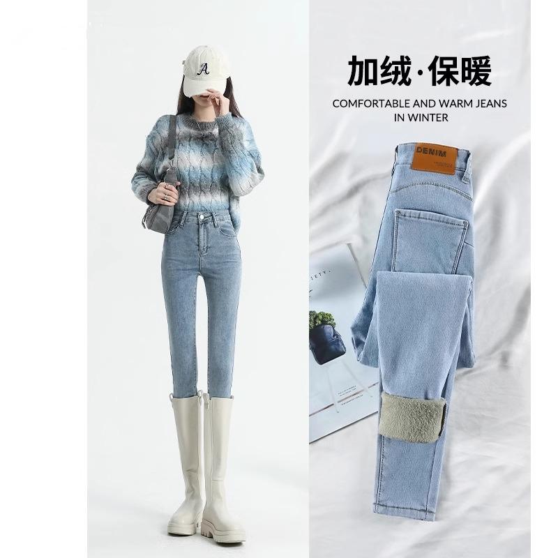 2024冬新特显瘦洋气浅蓝色高腰收腹牛仔裤女加厚薄绒修身小脚长裤