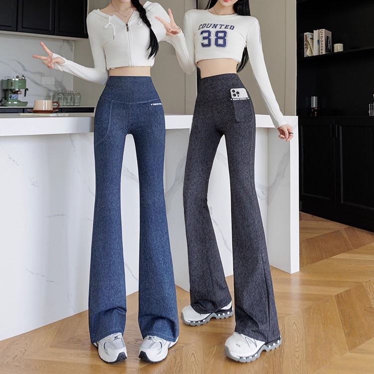 高弹仿牛仔微喇裤女外穿高腰双口袋鲨鱼喇叭裤收腹提臀瑜伽打底裤