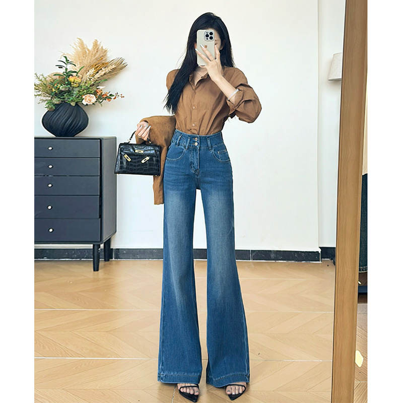 JIUHUAMU~高腰微喇芭比裤女修身高腰收腹提臀长裤弹力牛仔喇叭裤