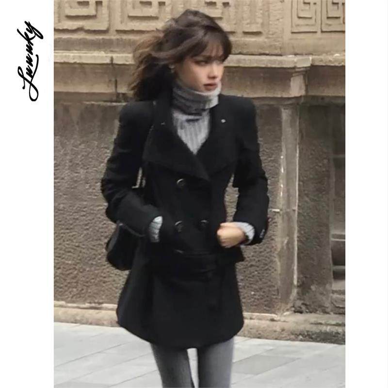 博主ranran同款黑色古早修身显瘦正肩毛呢大衣女复古中款风衣外套