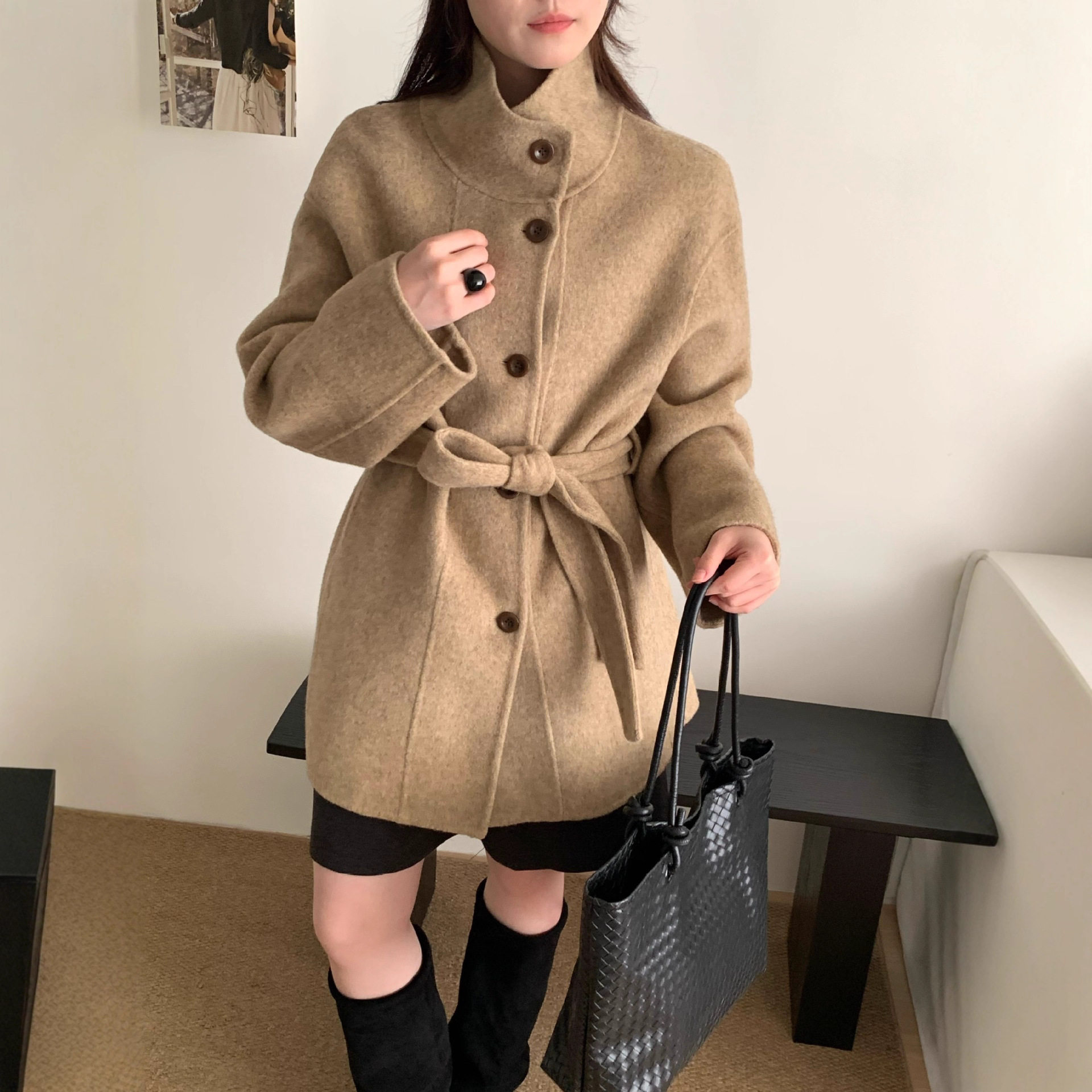 秋冬新款潮流高级感韩系立领中款双面羊毛绒修身小个子大衣外套女