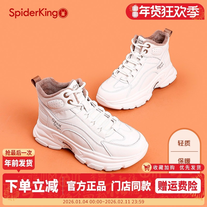 蜘蛛王真皮运动小白鞋女冬季高帮加绒保暖休闲棉鞋轻便厚底老爹鞋