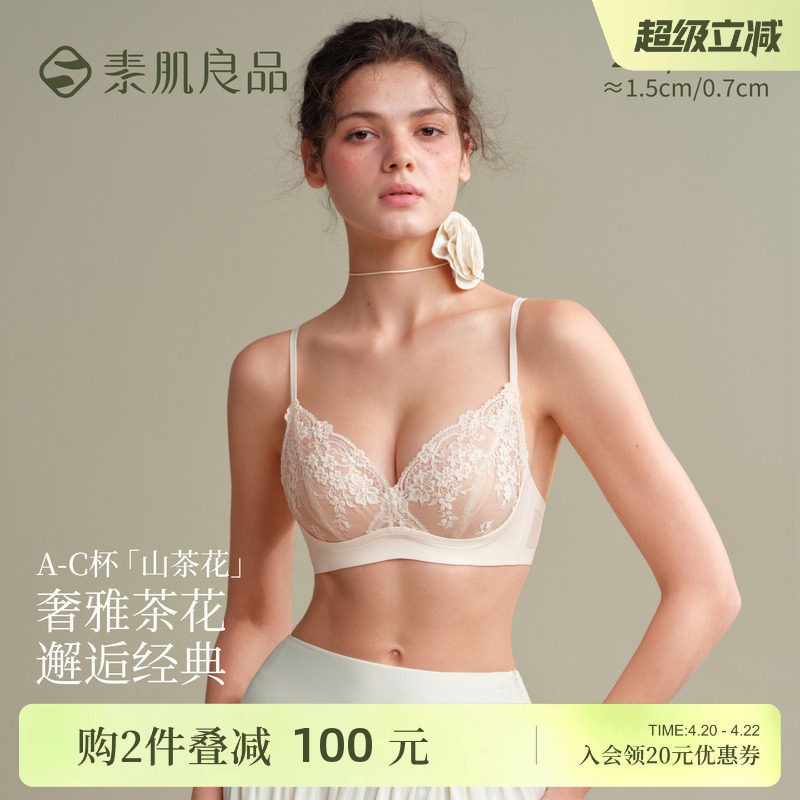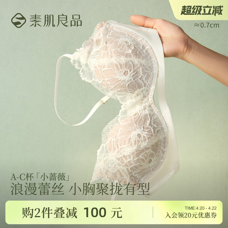 素肌良品小蔷薇无钢圈薄款透气内衣女蕾丝套装性感小胸聚拢文胸罩