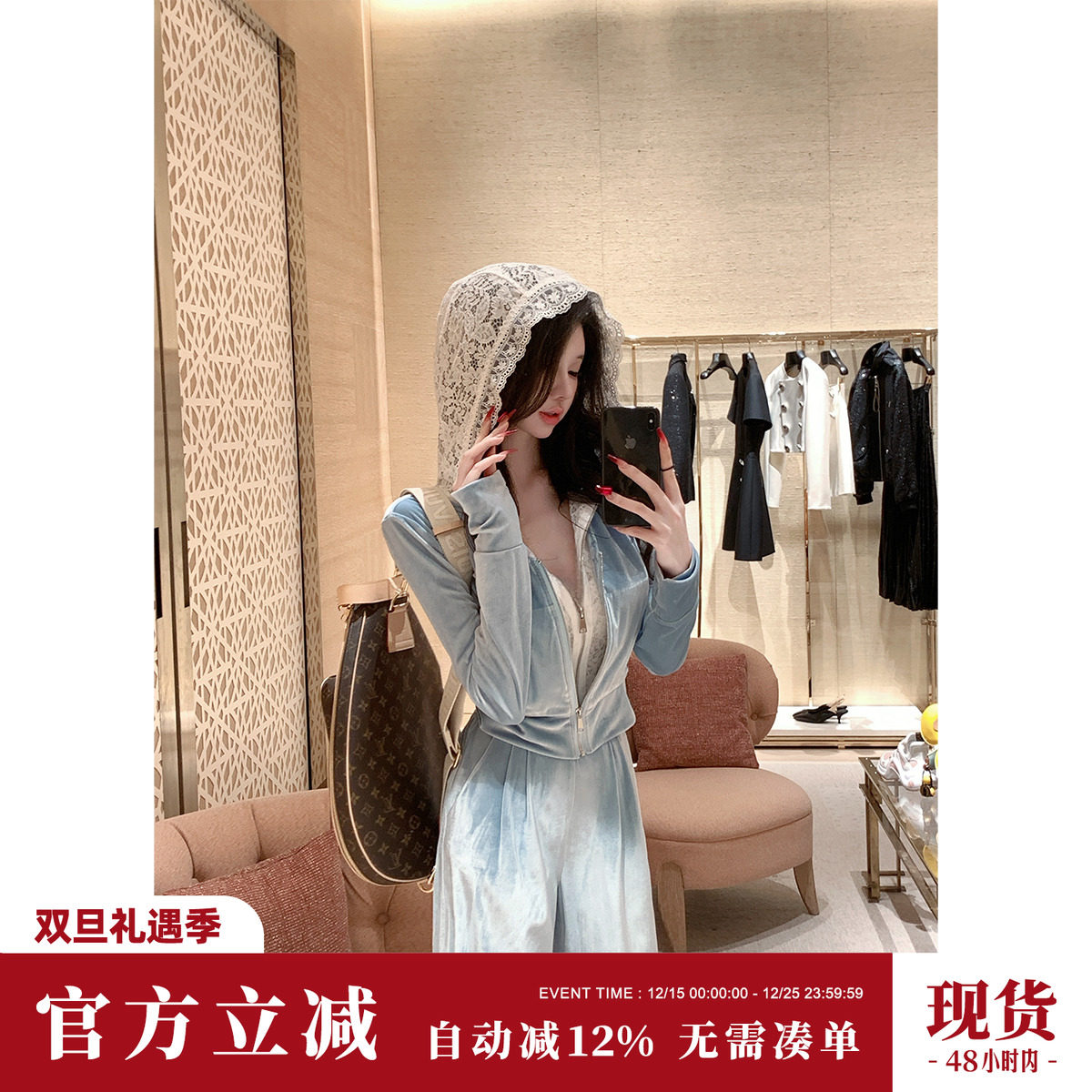 雅乔【华丽派对】2025新款冬蕾丝假两件丝绒卫衣阔腿裤运动套装女