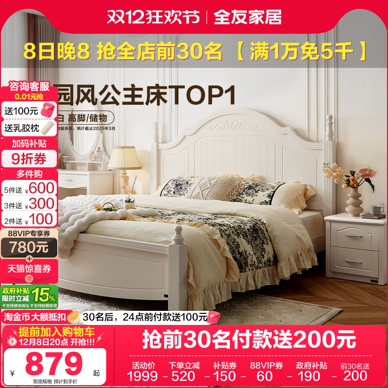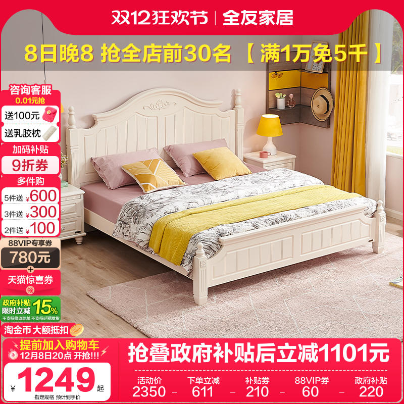 全友家居美式公主床高箱储物收纳单人板式床主卧室1米8双人大床