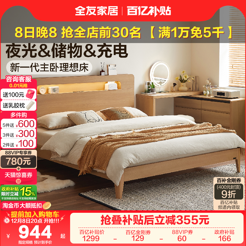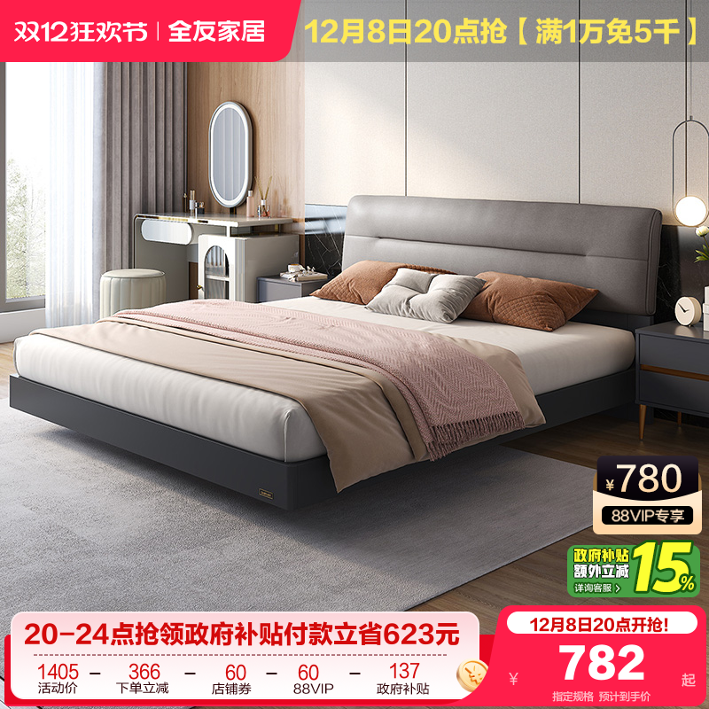 全友家居2025新款原木风板式床1米8双人床卧室储物1米5单人悬浮床