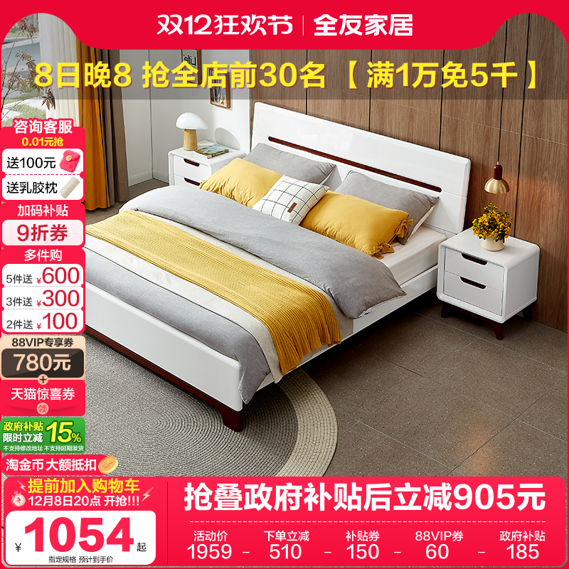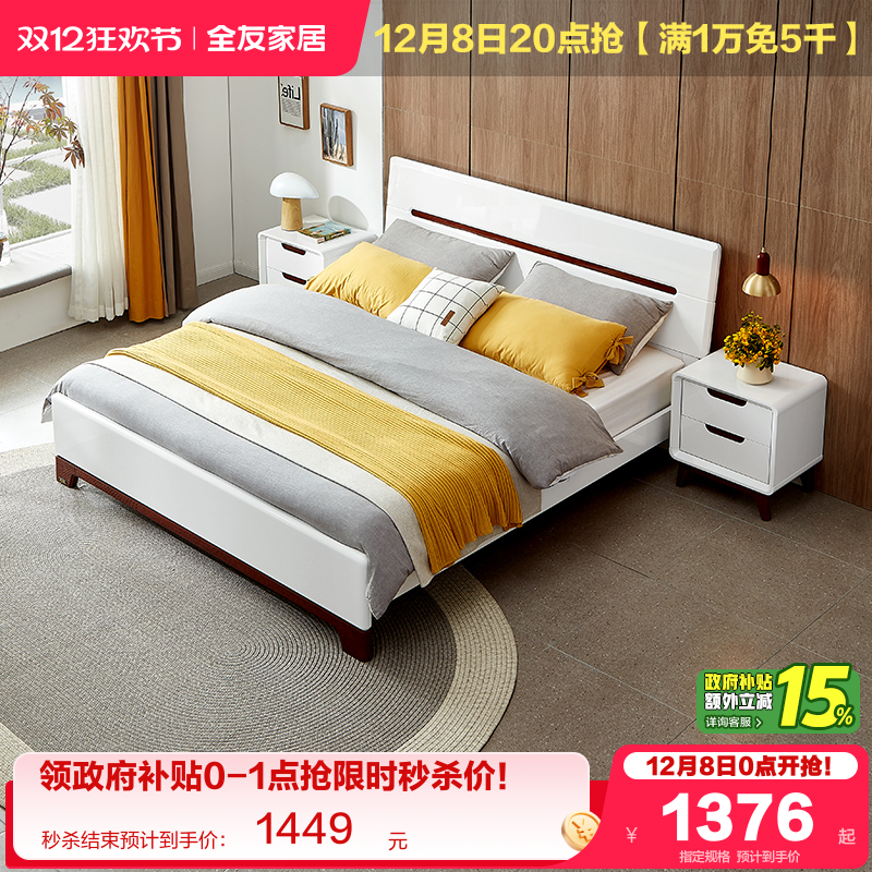 全友家居板式床现代简约实木床腿双人床1米8主卧室储物收纳大床