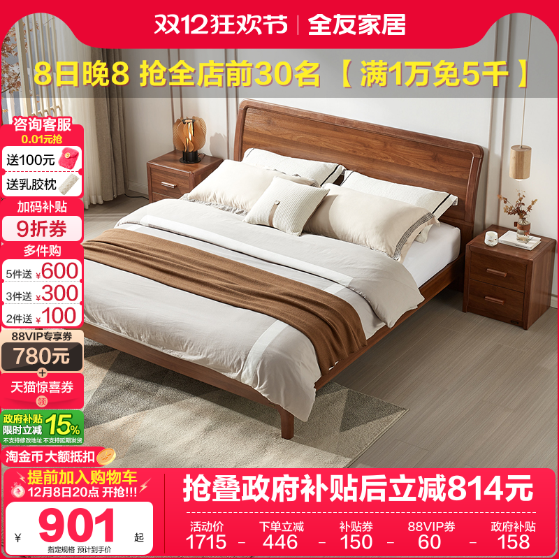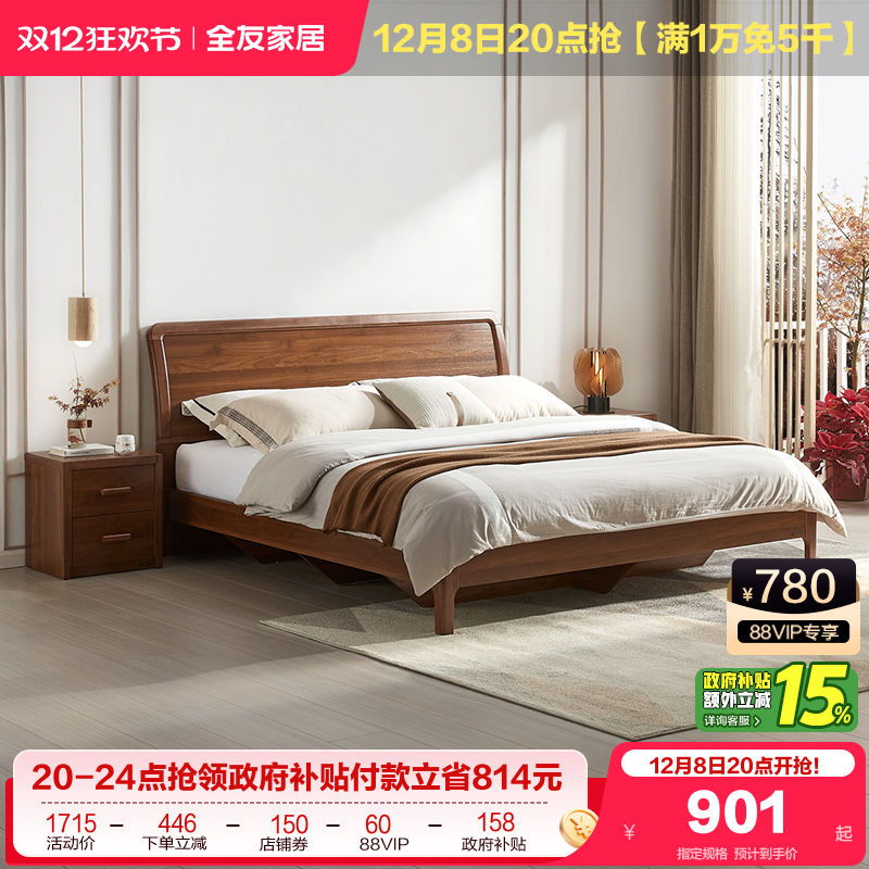 全友家居新中式实木框落地床主卧室1米8双人大床1米5储物板式床