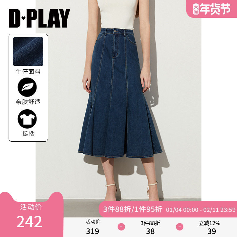 DPLAY2025年秋季通勤蓝色高腰裙身鱼尾中长裙半身裙牛仔半裙