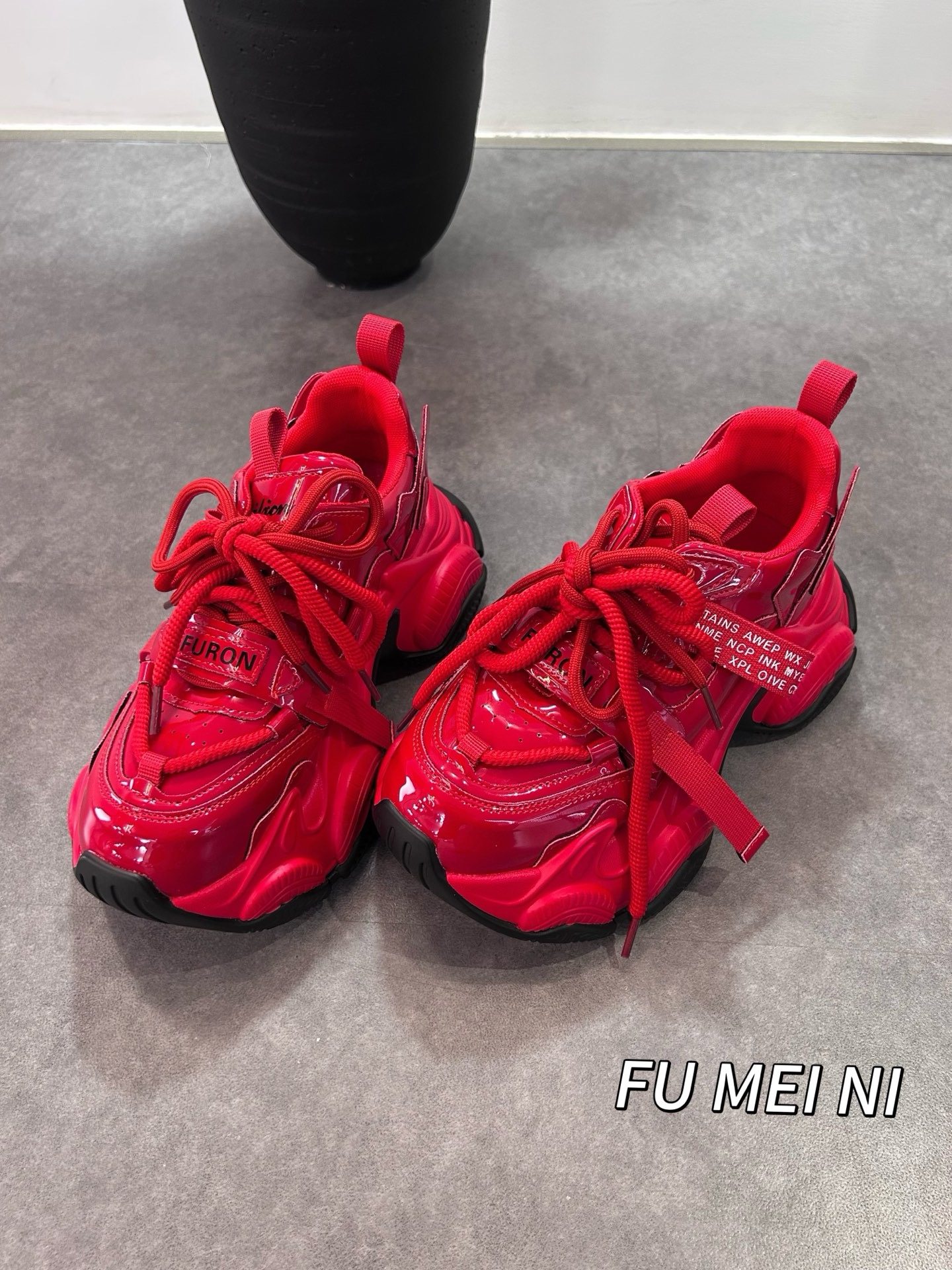 2026早春新款过年红色增高老爹鞋女亮皮透气休闲运动鞋潮百搭女鞋
