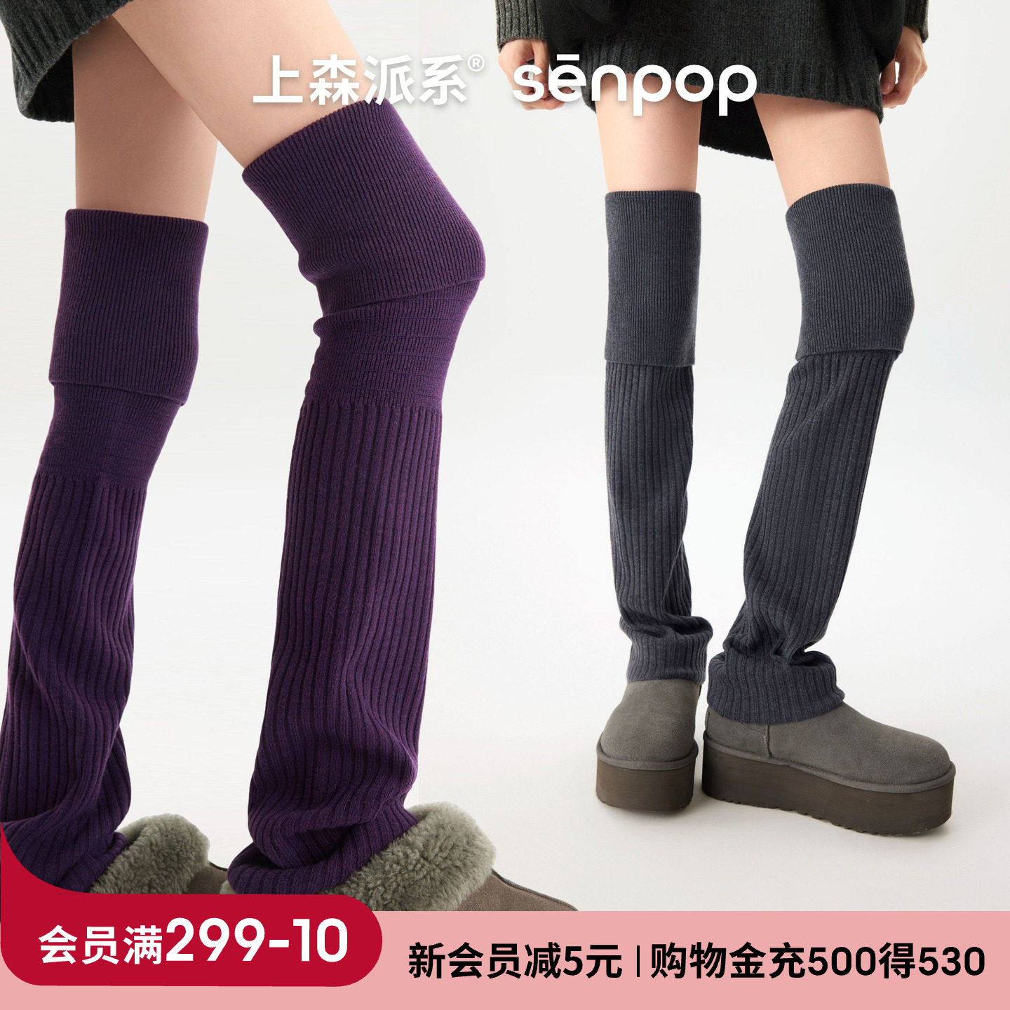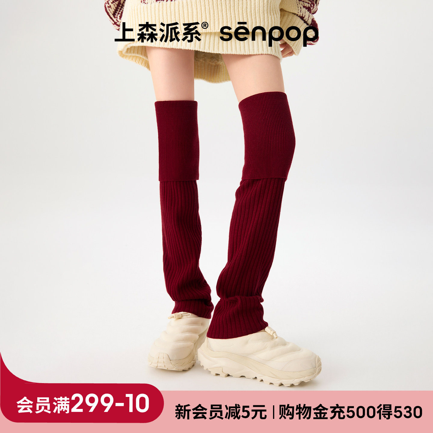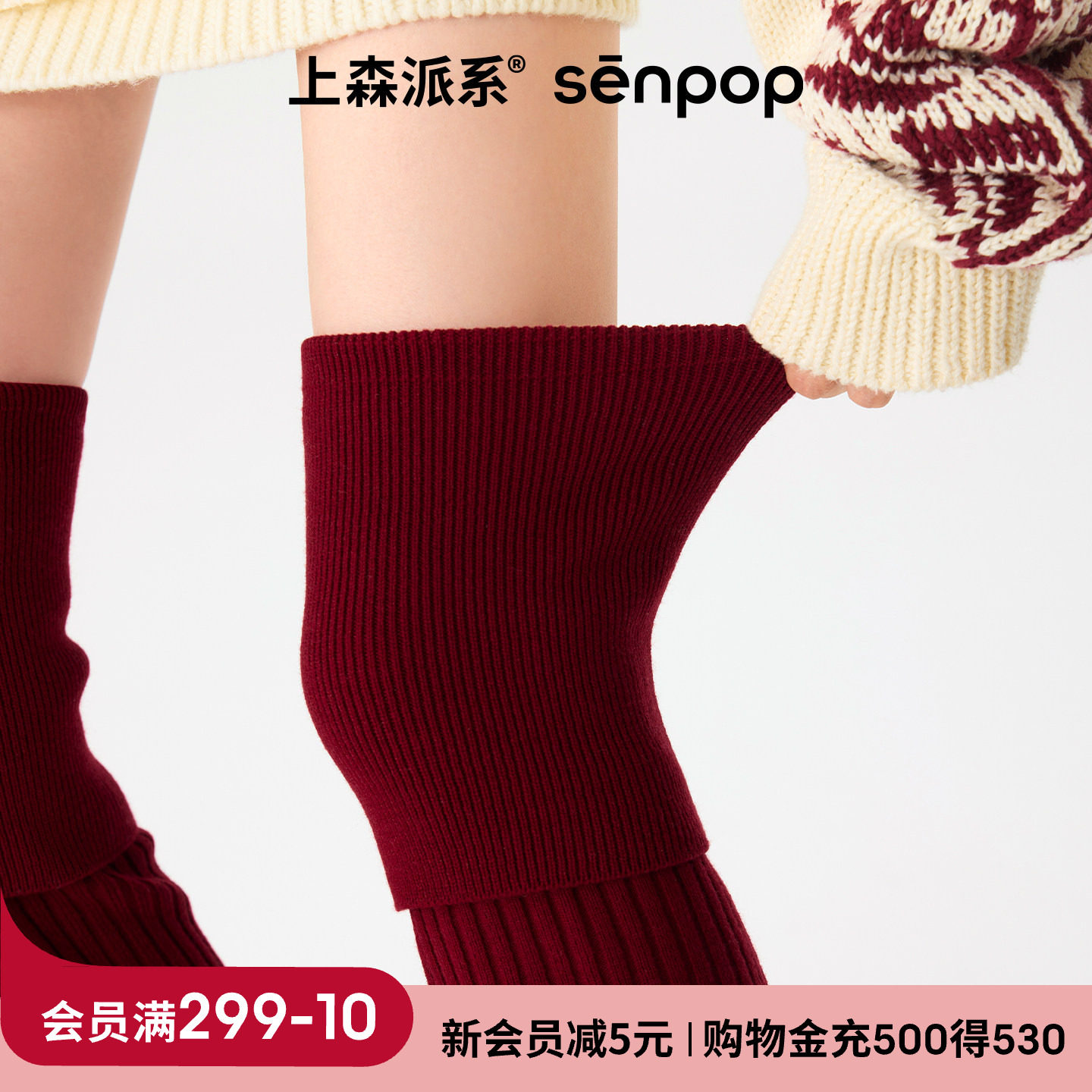上森红色羊毛袜套秋冬款翻边过膝袜套条纹高筒袜套护膝腿套senpop