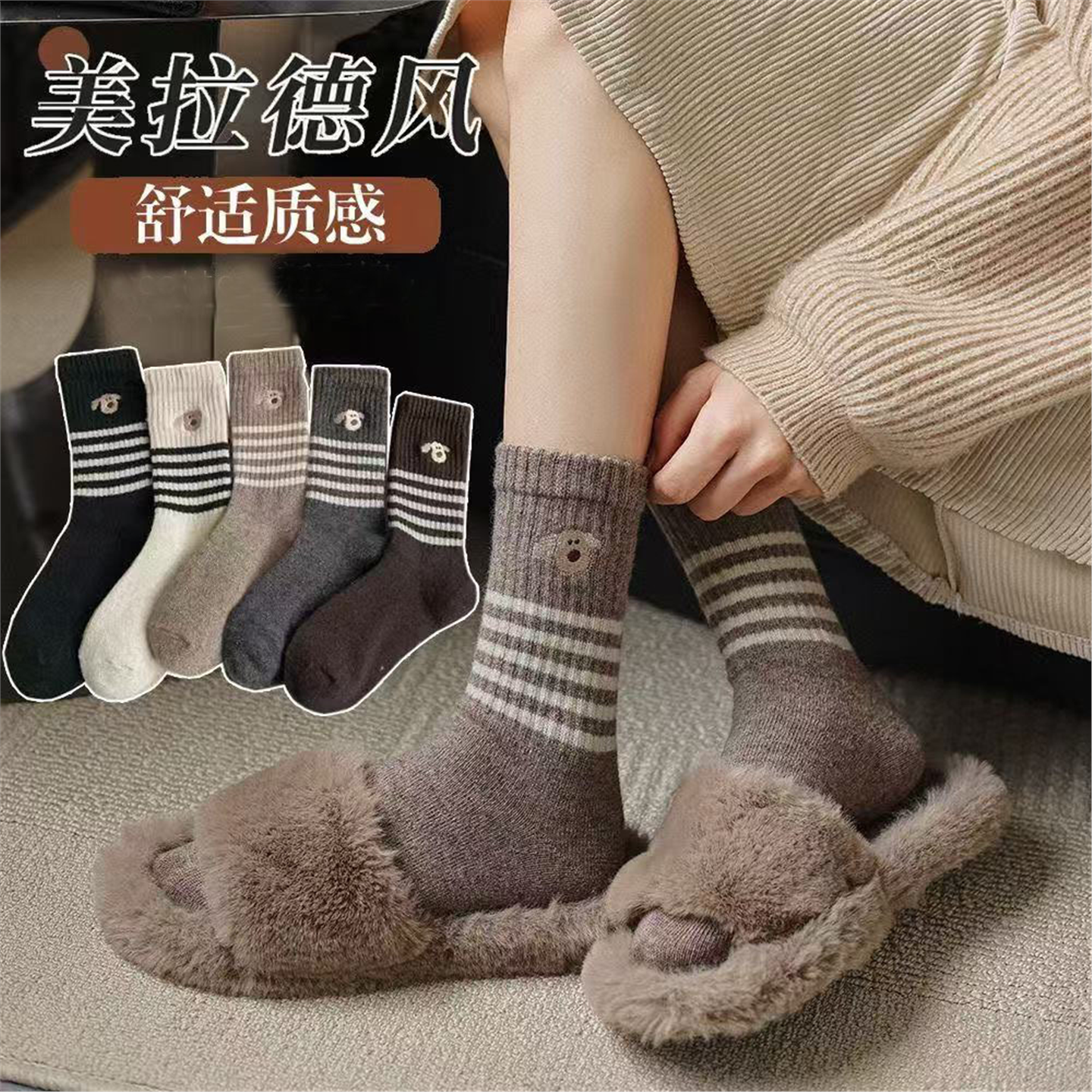 秋冬季加厚保暖中筒袜ins潮复古美拉德色小狗条纹高筒袜学生百搭