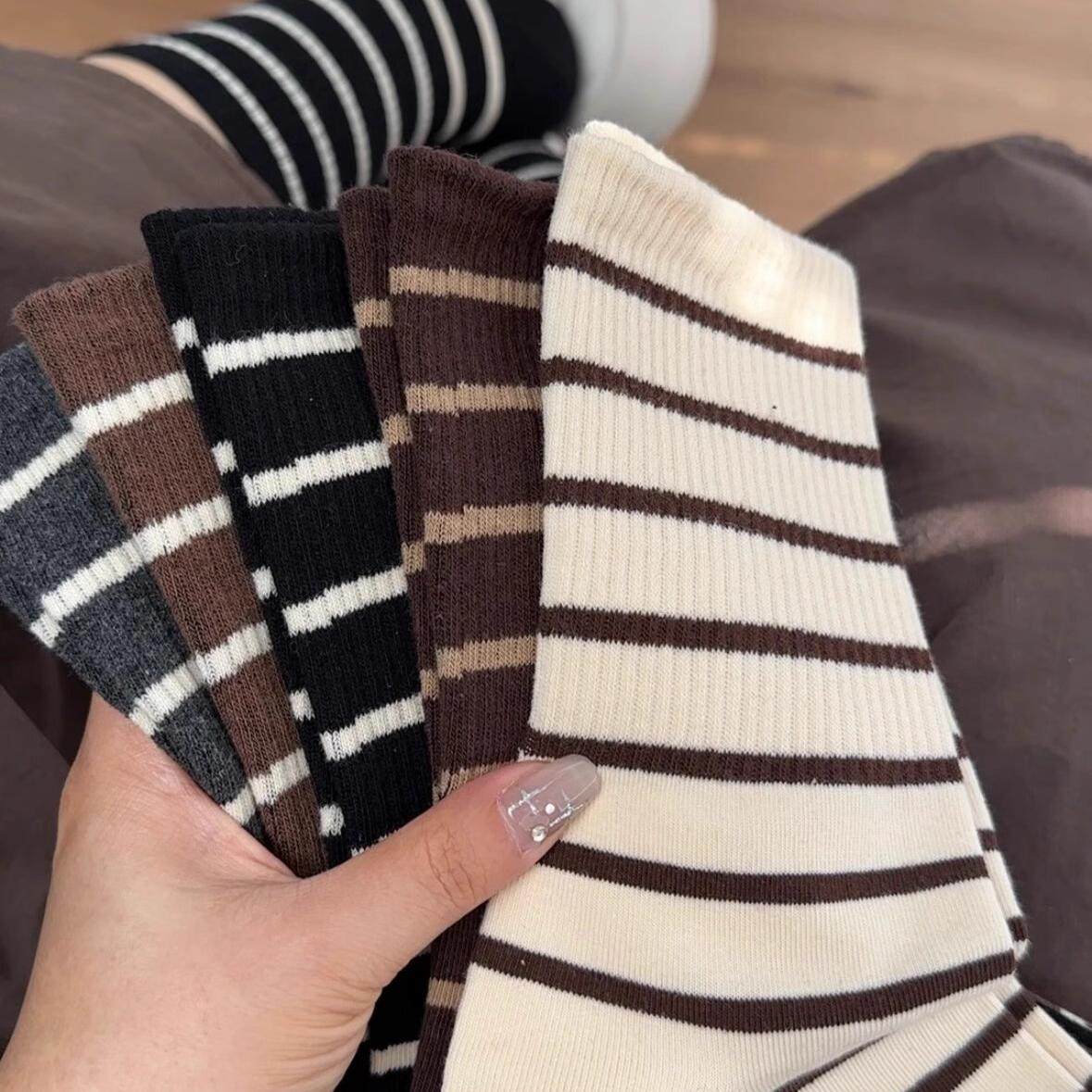 袜子女款纯棉复古美拉德色系高筒吸汗秋冬款无骨运动条纹中筒棉袜