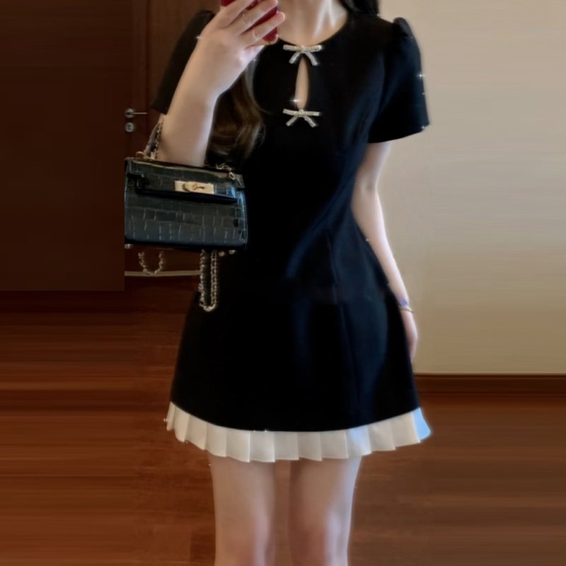大码胖mm新中式高级感蝴蝶结镂空收腰连衣裙女改良显瘦a字小黑裙