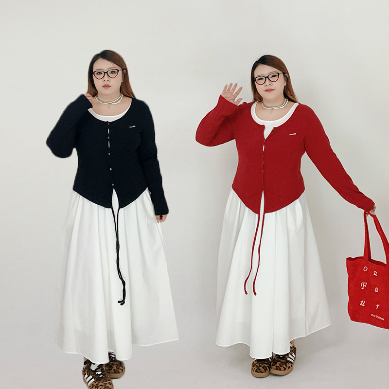 绮娑秋冬装新款法式气质收腰A字裙显瘦大码胖MM长袖假两件连衣裙