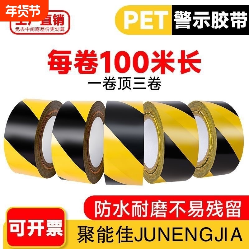 黑黄警示胶带PET大卷100米防水加粘车间分区划线贴地面标识安全警示胶带斑马线地面贴