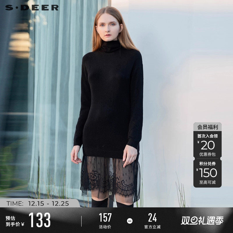 sdeer圣迪奥冬装女装罗纹网纱蕾丝拼接针织连衣裙女S21463526