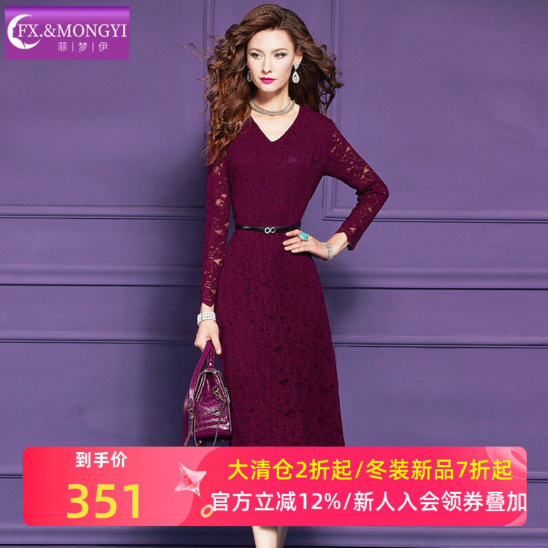 菲梦伊水溶蕾丝连衣裙女冬装轻熟名媛气质女人味收腰V领打底裙子