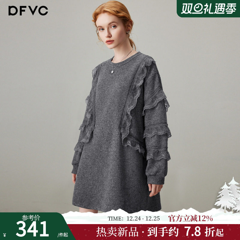 dfvc时尚休闲圆领卫衣裙女2025年冬季新款蕾丝花边宽松冬装连衣裙