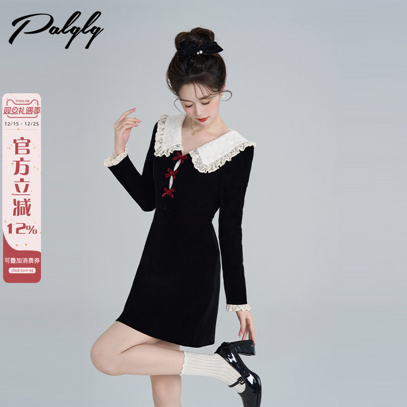 赫本风娃娃领黑色丝绒连衣裙女冬装高级感法式气质名媛拼接蕾丝裙
