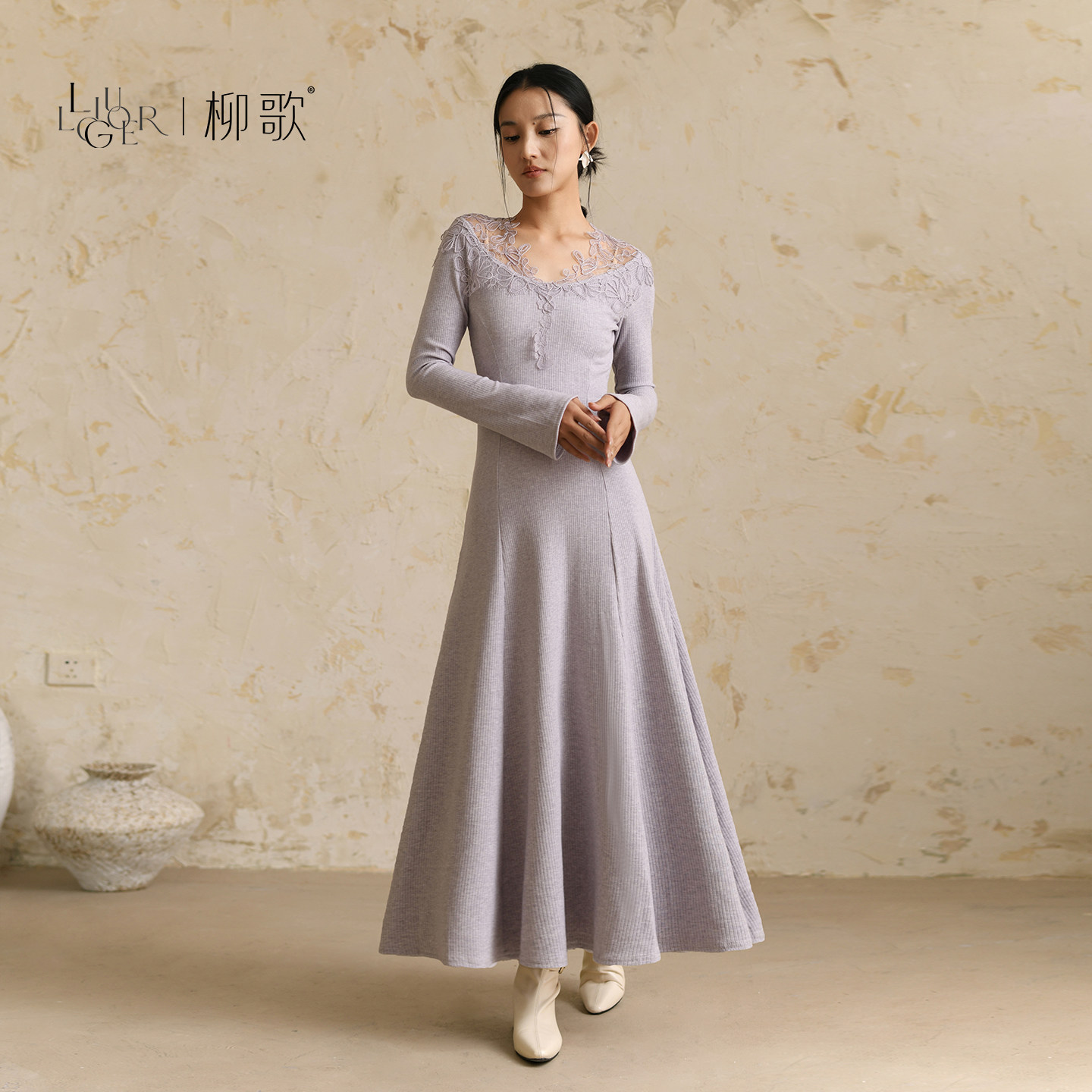 柳歌千金感穿搭大摆裙子女冬装法式温柔风打底长袖拼接蕾丝连衣裙