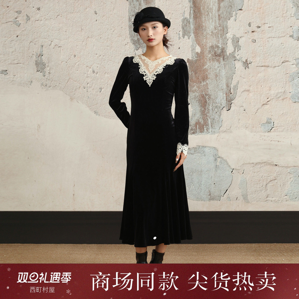西町村屋法式鱼尾裙女2025冬装新款蕾丝拼接收腰连衣裙XXAD10677