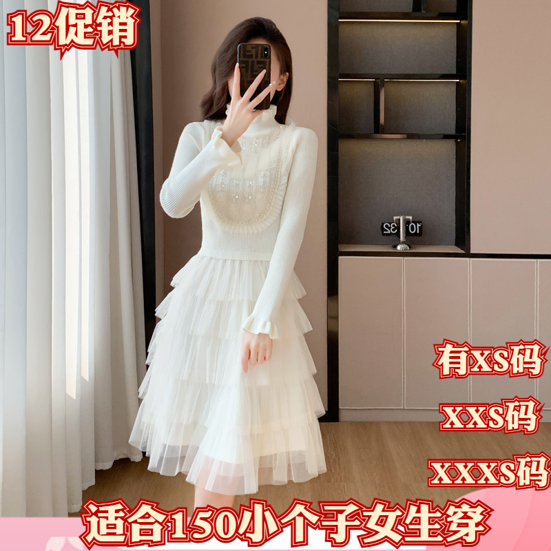 150cm显高冬装加小码女装小个子XXXS蕾丝亮片裙拼接网纱连衣裙女