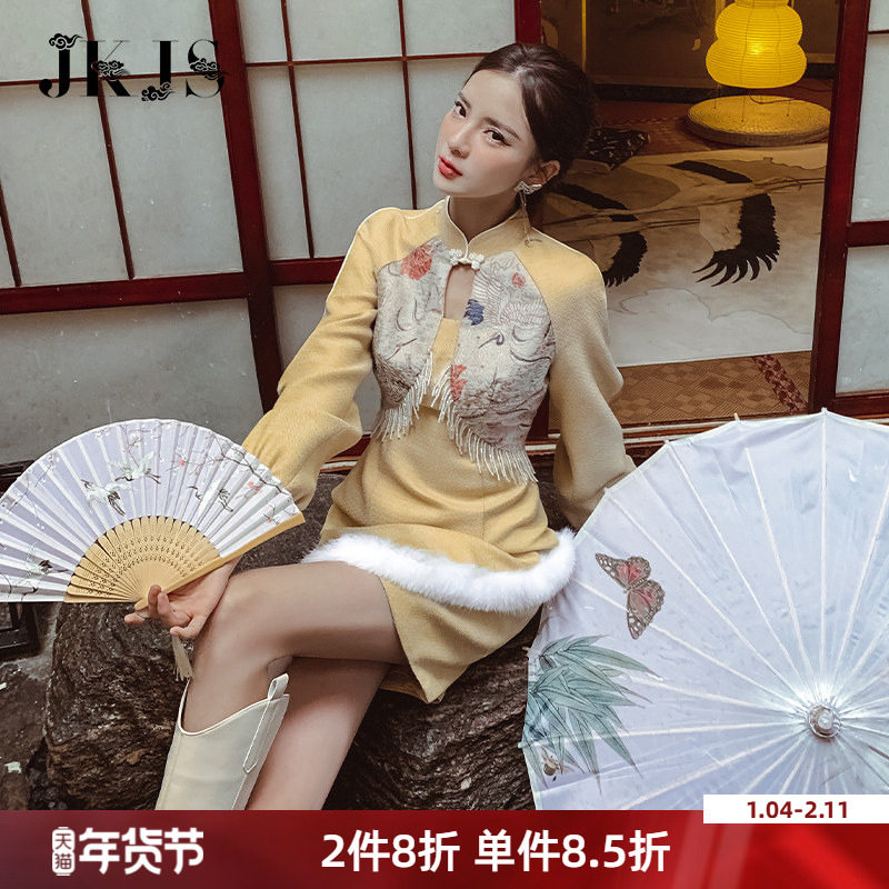秋冬新款针织提花绝美改良旗袍新中式连衣裙冬装加绒 厚款兰陵王