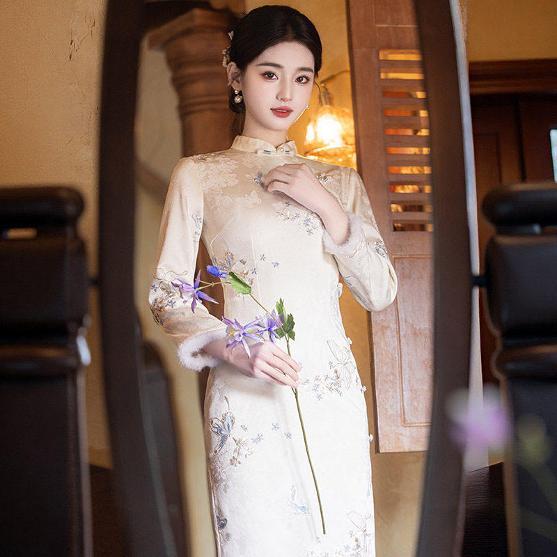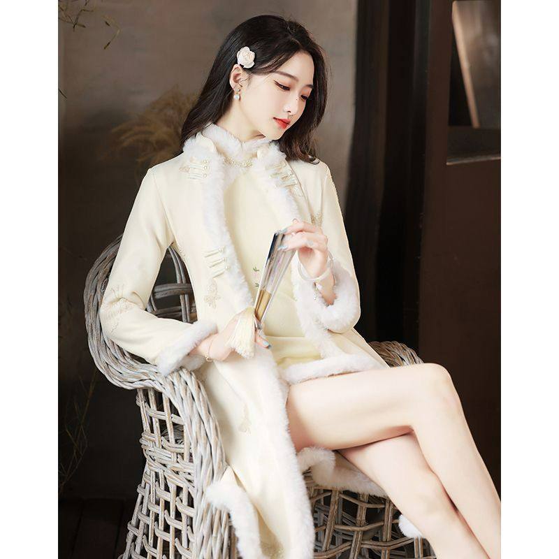 苍山雪新中式改良旗袍冬季加厚2025新款毛领保暖米白色素雅女优雅