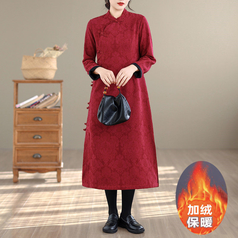 国风复古加厚改良旗袍冬款加绒提花高端气质女装新中式连衣裙过膝