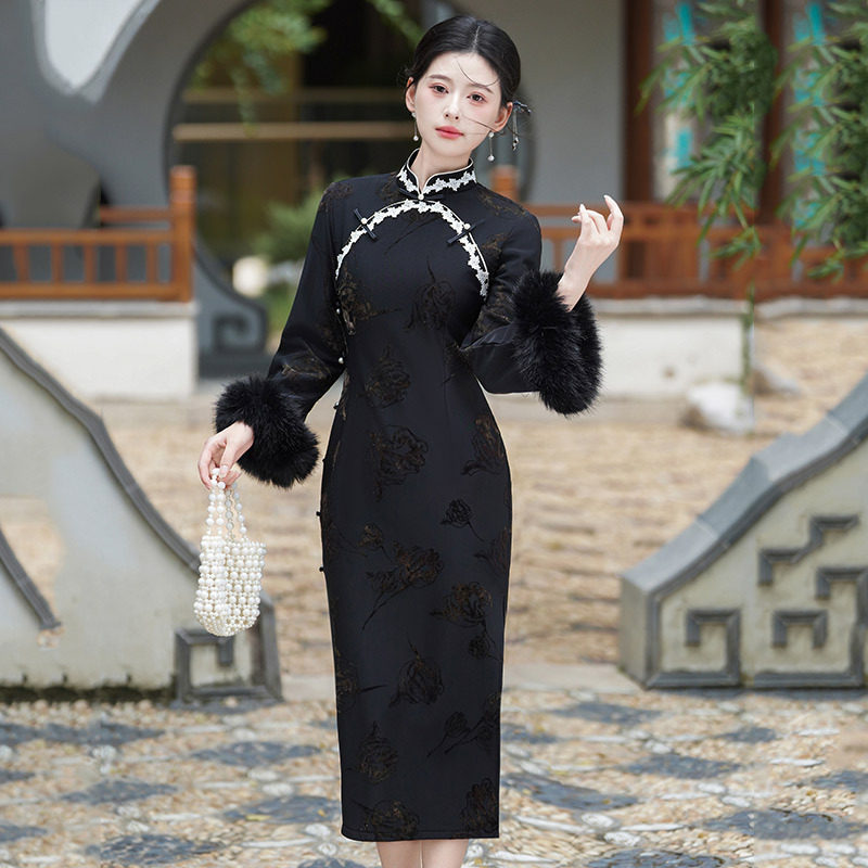 黑色改良旗袍冬装2025新款年会走秀高端气质加厚年轻款少女连衣裙