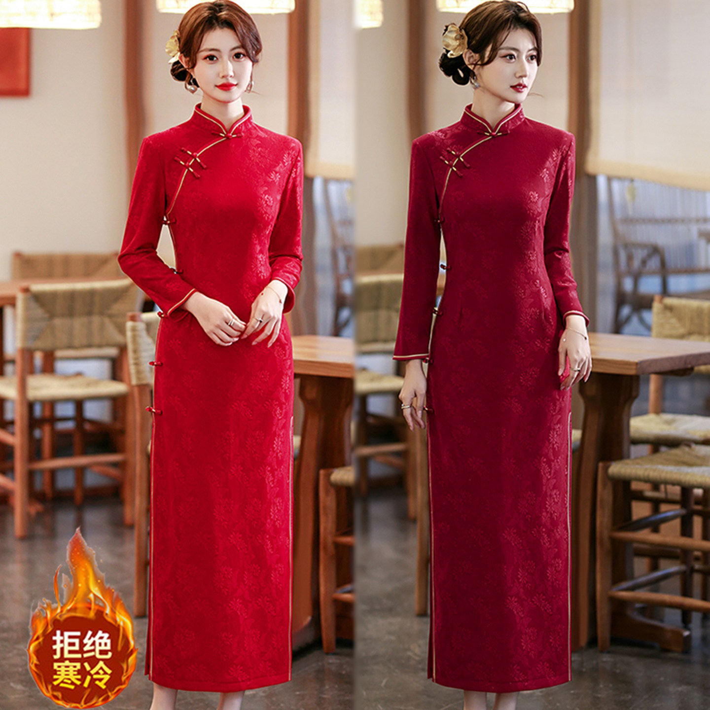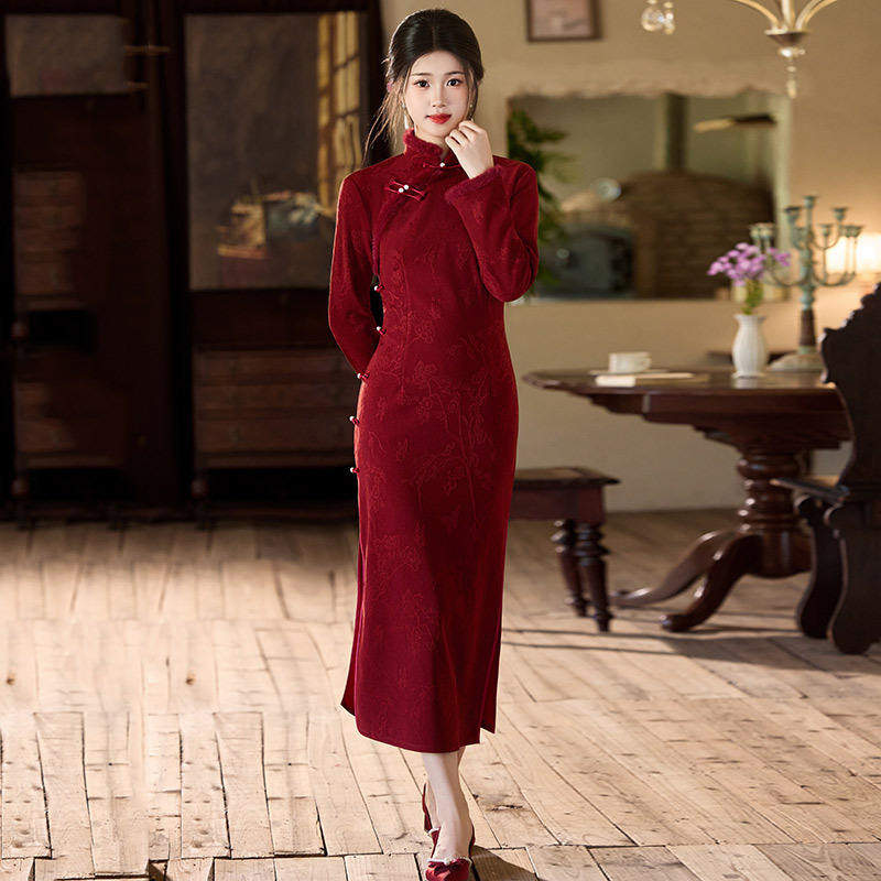 酒红色复古老上海女士旗袍秋冬款加绒新中式长袖改良旗袍冬季长款