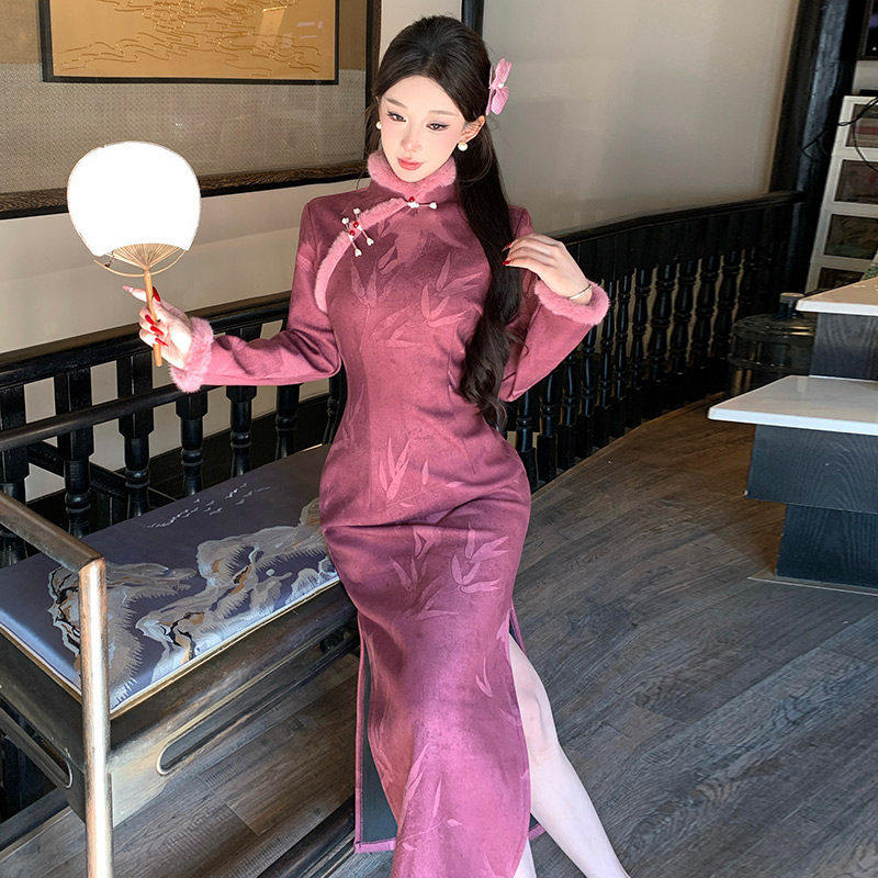 抹茶麻薯2025年冬季新款改良旗袍绣花麂皮绒加绒淑毛领女范新中式