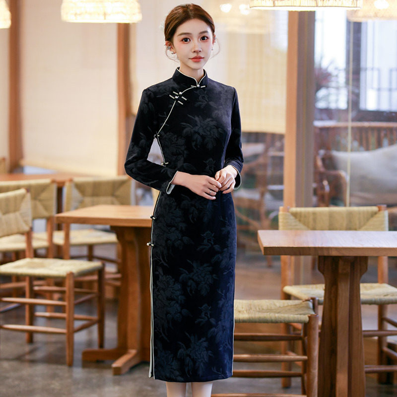 黑色加绒国风苏州长袖改良旗袍冬季厚款女新中式2025新款妈妈秋冬