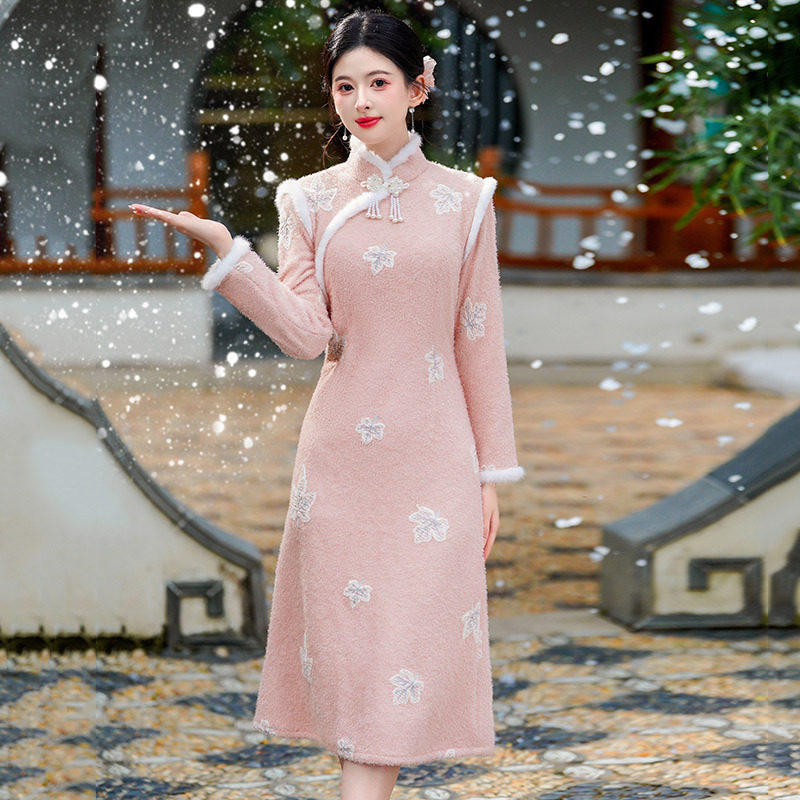 2025年巨好看新款女新中式改良旗袍冬装加绒加厚保暖清新日常粉色
