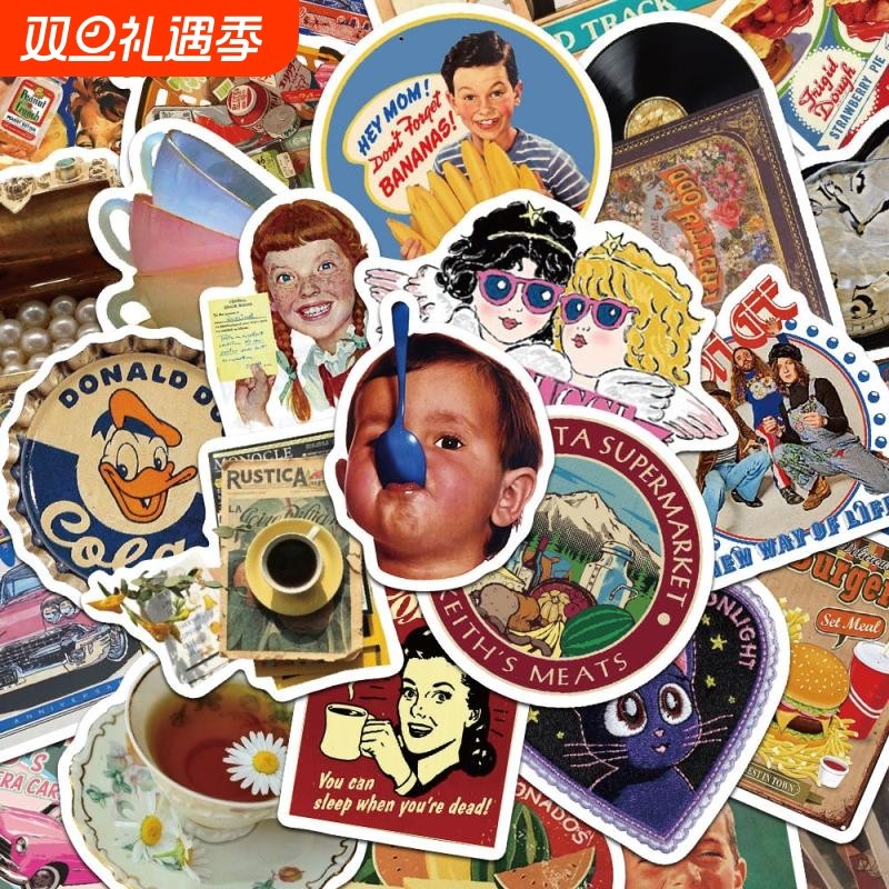 50张美式复古风贴纸怀旧艺术个性创意手机壳笔记本行李箱防水贴画吉他旅行箱头盔粘贴平板高级开学