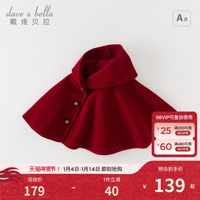 戴维贝拉婴儿斗篷秋冬装儿童外出披风小女孩圣诞红色披肩外套洋气
