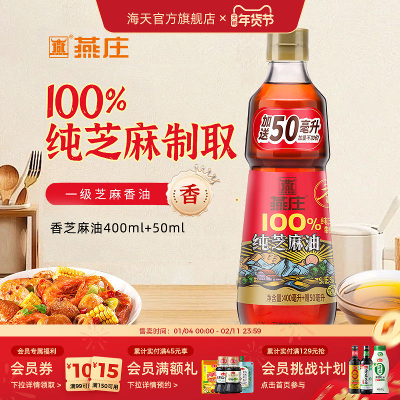 海天燕庄芝麻香油400ml+50ml家用瓶装凉拌菜火锅油碟小磨油调味品
