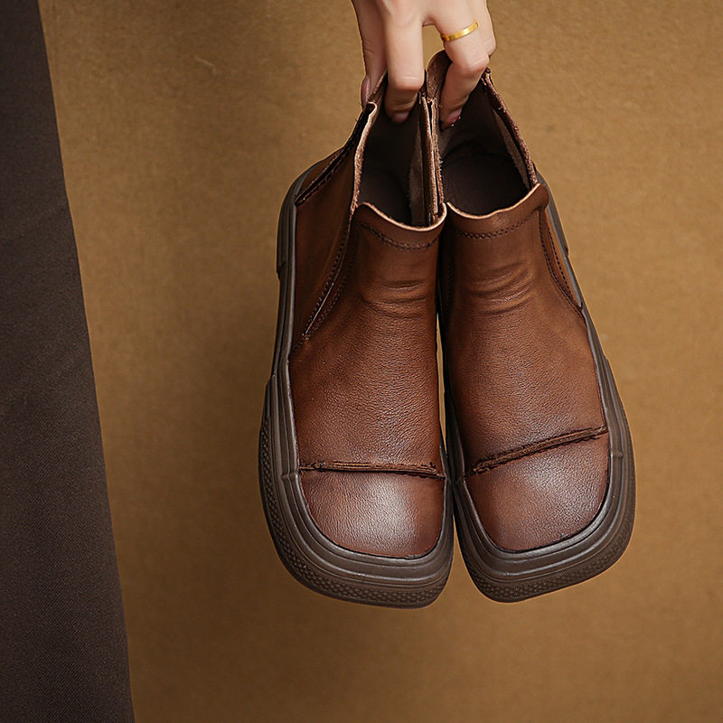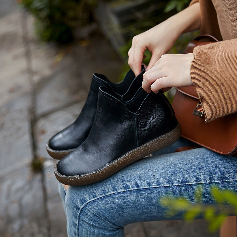 2025春秋款短靴女复古真皮内增高女靴牛筋底单靴子平底休闲女鞋