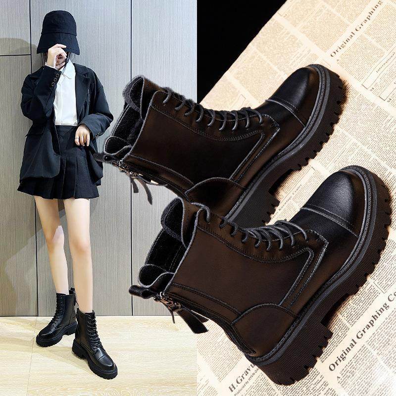 2021冬季新款平底短靴粗跟马丁靴英伦风加绒裸靴女靴子春秋款单靴