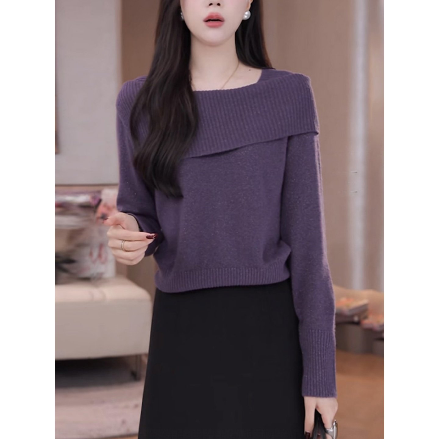 紫色套头毛衣女士秋冬季慵懒高级感宽松显瘦一字领打底针织衫上衣