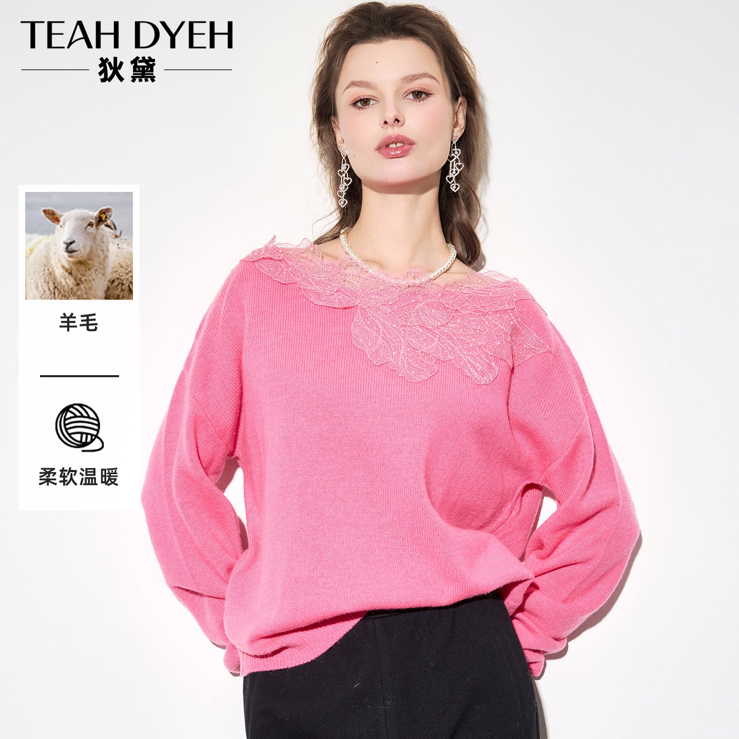 玫红果然显气色 100%羊毛 蕾丝钉珠斜肩一字领打底针织衫毛衣