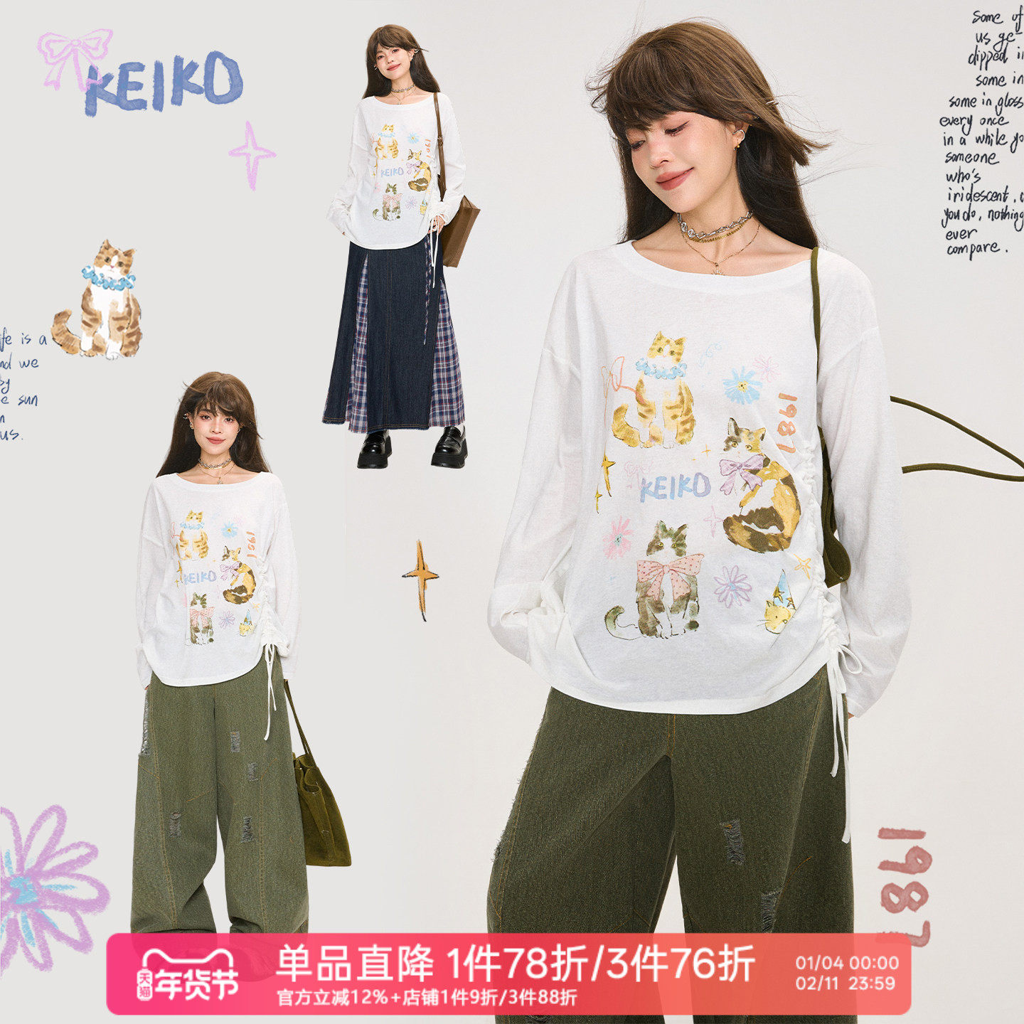 KEIKO 可爱萌猫印花抽绳T恤女25新款慵懒休闲一字领打底长袖上衣